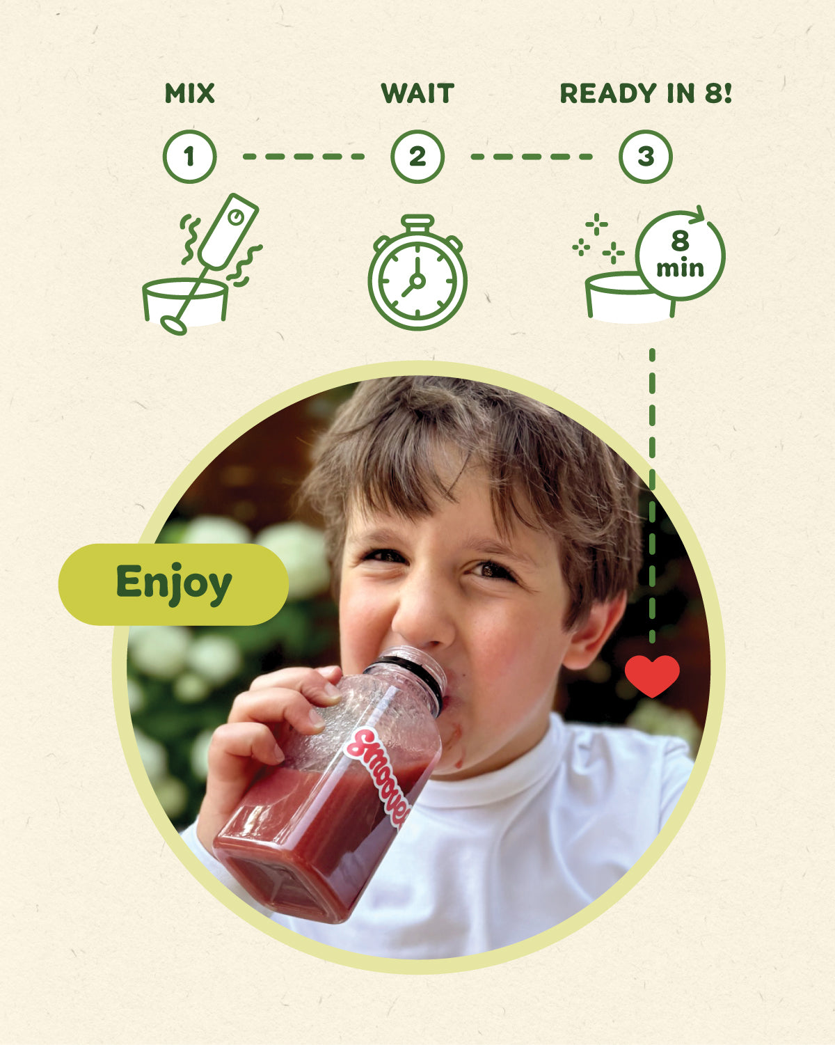 Individually packaged for easy mornings. Just mix, wait, and your delicious fibre rich Smoovee is ready in 8 minutes. No blender needed.